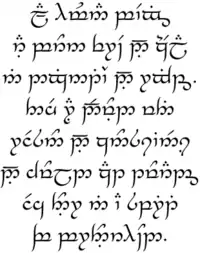 Tolkien used the tengwar to write texts for his fictional world Middle-earth and other things. He used it to write in the languages he invented (for example Quenya and Sindarin), but also used the tengwar to write English.